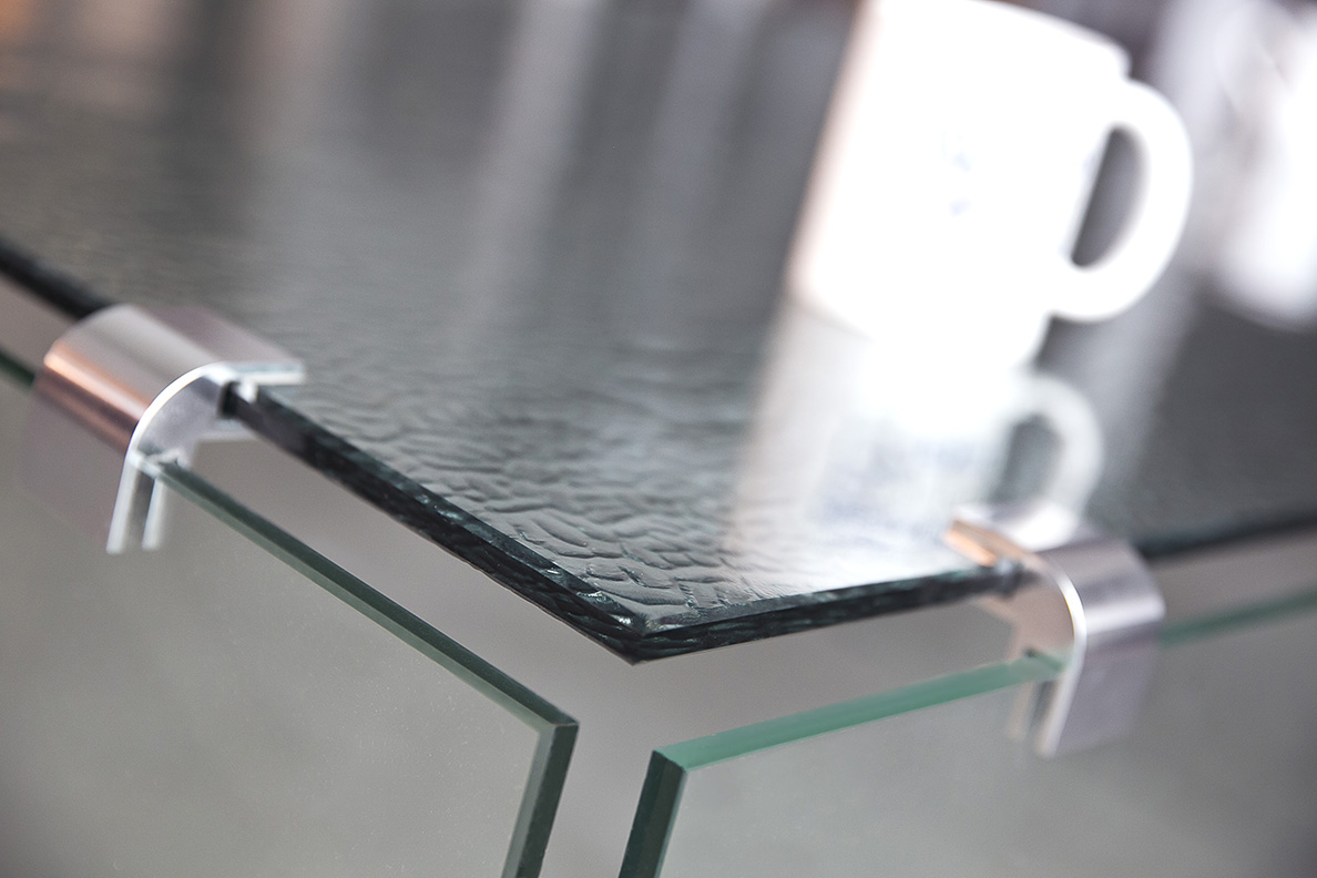 This custom coffee table is a design created at Koonse Glass. It consists of 5 glass panels and modern metal brackets holding the panels.